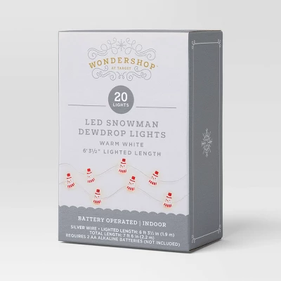 Anchor your seasonal display with the magical glow of these LED Dewdrop Christmas Novelty String White Light Bulb Color with Silver Wire Snowman from Wondershop™ Featuring a silver wire strung with red-and-white snowmen and fitted with 20 warm white dewdrop LED bulbs, these novelty string lights add an adorable, glowing touch to indoor spaces. Weave these lights through bookshelves or countertops, spiral them around your Christmas tree, or wind them around a mirror for a festive, fun look.