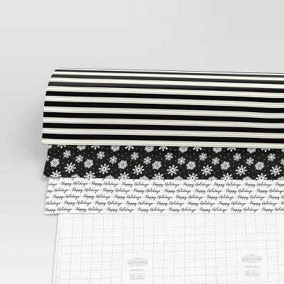 Wrap presents for everyone on your list in festive style with the 30-Inch 180-Square-Foot Christmas Stripes/Happy Holidays/Snowflakes Gift Wrap from Wondershop™. This gift wrap trio includes one roll with stripes, one with snowflake print on a white backdrop, and one with the repeated text “Happy Holidays.” Great for wrapping gifts of all sizes, the trio gives you 180 square feet of total wrap for lasting use.