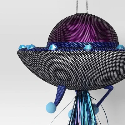 Make your holiday tree look unique with this Christmas Spaceship Ornament from Wondershop™. This Christmas ornament features a metallic spaceship in mesh design with sparkly tinsel hanging from it for a playful look. Easy to coordinate with various holiday tree ornaments, this spaceship ornament features an attached gold-tone loop that makes it easy to hang from the Christmas tree.