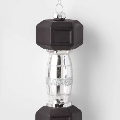 Add fitness themes to your festive tree with this Dumbbell Glass Christmas Tree Ornament from Wondershop™. This glass tree ornament adds more fun to your holiday decor. It showcases a black and silver dumbbell-shaped accent with shimmery glitter details for a cute whimsical look. Plus, it comes with an attached loop and string on top for easy hanging.