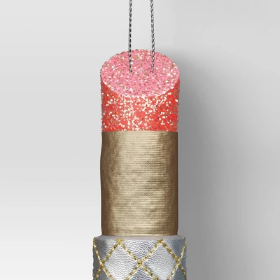 Trim your tree with a pop of magical pout with this Christmas Fabric Lipstick from Wondershop™. Made from polyester, this hanging ornament is shaped like a gold-glitter accented red lipstick tube in a gold and silver outer shell. Sure to add a glam touch to your tree, it also has a built-in top loop for easy hanging from the branches.