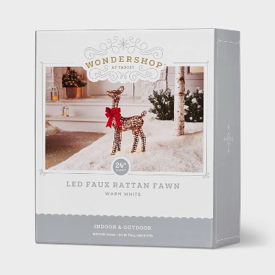 Light up your indoor or outdoor space with the woodland magic of this LED Faux-Rattan Fawn with Red Bow Christmas Novelty Sculpture Light from Wondershop™. Made of iron, this decorative figurine showcases a standing deer with a woven rattan-like design in brown sporting a bright red bow on its neck with trailing ties. It’s wrapped in a brown wire adorned with 50 white LED bulbs, casting a gentle glow with festive charm.